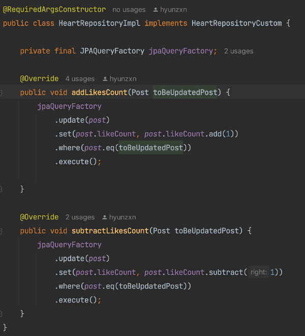 Querydsl로 Update 쿼리 날렸는데 테스트에 실패하는 경우 - 영속성 컨텍스트와 관련하여 1. 들어가며 간단한 게시판 구현 프로젝트를 하고 있습니다. 이번 포스팅에서 다뤄볼 주제는 게시글에 대한 좋아요 카운트 업데이트에 대한 테스트코드를 작성할 때 제가 만난 에러에 관한 것입니다. 구글링을 이것저것 하다보니 (전 ChatGPT를 한 번도 써보지 않았습니다! 그렇게 좋다고 하던데..구글링이 익숙해서일까요 ㅎㅎ) 이것도 결국 영속성 컨텍스트와 관련한 이슈였습니다. 영속성 컨텍스트는 정말 JPA를 쓸 때 철저하게 알아야 하는 개념인 것 같습니다. 2. 사용된 코드 전체 코드는 제 깃허브에서 확인하실 수 있습니다. 이 포스팅에서는 사용한 코드만 보여드리도록 하겠습니다. [HeartRepositoryImpl] [테스트코드] 테스트코드는 통과된 최종적으로 완성된 상태의 코드입니다. 3. 어떤 이슈가 있.. TIL 2023.03.23