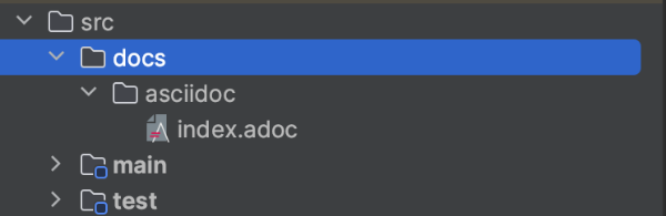 src/docs/asciidoc 디렉토리를 직접 생성해준 후 index.adoc 파일을 생성해줍니다.