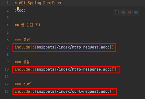 index.adoc 파일에는 스니펫 경로에서 어떤 것을 가져올지에 대해 세팅을 해주면 됩니다.