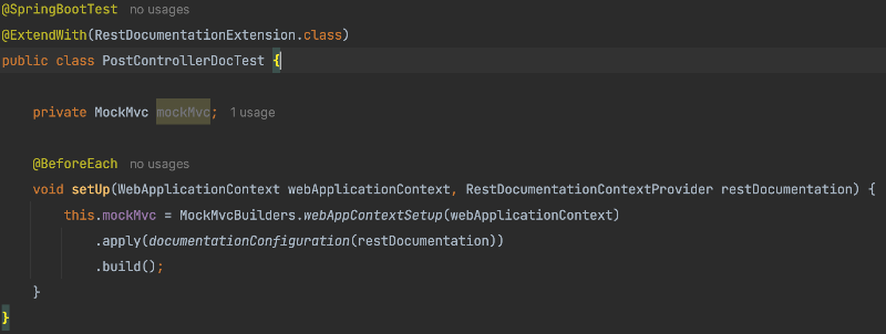 서두에서 언급하였듯이 Spring Rest Docs는 테스트코드 기반으로 API 문서가 만들어지기 때문에 테스트코드를 작성해야합니다. 임의의 테스트코드 클래스를 만들어 주는 것이 좋습니다.