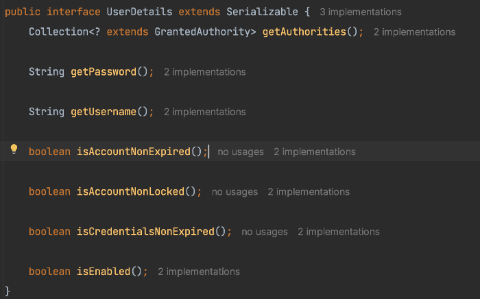 UserDetails란 스프링 시큐리티에서 유저의 정보를 담는 인터페이스입니다.